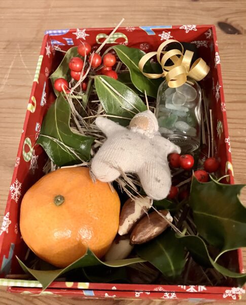 Finally, I thought I would make my own ‘vessel-cup’ and fortunately, for my peers, I won’t be subjecting them to a rendition of ‘God rest you, merry gentlemen’! I decided to have a bottle of sea-glass tied with a gold ribbon to represent gold, frankincense and myrrh. Merry Christmas!
