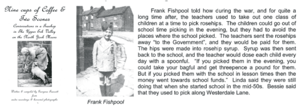 Rosehip Collecting – an activity that most schools partook in; a government scheme that continued into the late 1950’s/1960’s (Nine Cups of Coffee, Page 61, 942.747 ESK)