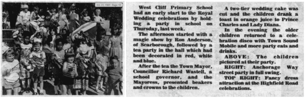 This West Cliff Primary School article comes from July 31st 1981 – Royal Wedding Celebrations “…the children drank a toast in orange juice to Prince Charles and Lady Diana.”