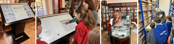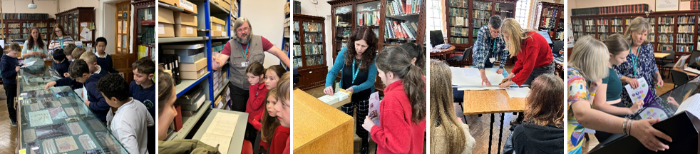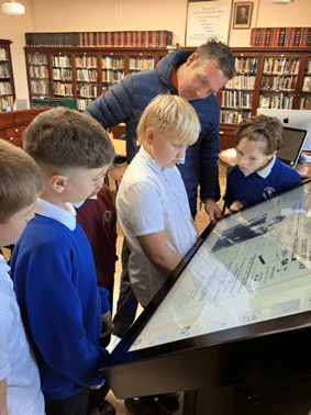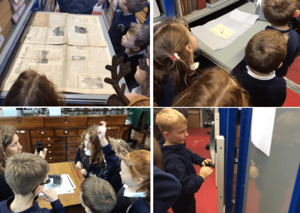 The session with the Year 2’s began by splitting into two groups. One group headed into the museum to look at childhood related items and the Eskdale School Exhibition. The other group split and headed with Charles (Archivist) into the Tommy Roe Archive Room to look at old newspaper articles about the opening of the school and a quill pen that had been found with the muster rolls when they were discovered; whilst half the group joined me in the library to look at a selection of school items and the stories behind them.